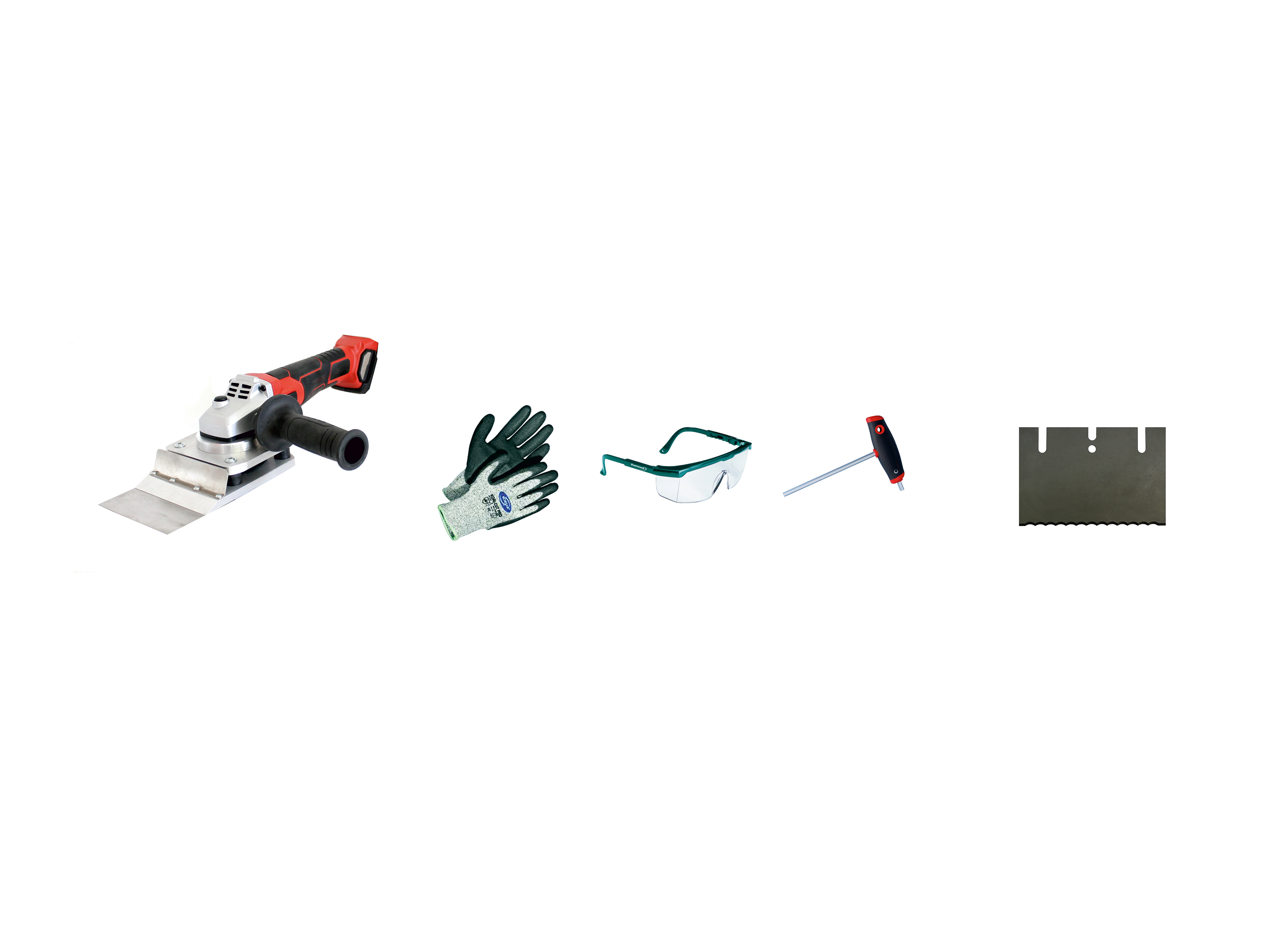 Compact Stripper 18V im Karton mit: Klinge 80 x 120 x 0,6 mm, Wellenschliffmesser 80 x 120 x 1,0 mm Handgriff, Schutzbrille und Schutzhandschuhe, Sechskantschlüssel SW 4,0 x 150 mit T-Griff (ohne Akku, ohne Ladestation)